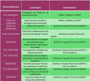 A Prefeitura de Boa Vista, por meio da Secretaria Municipal de Assistência Social (SMAS) abre a partir desta quarta-feira, 11, as inscrições para o Programa de Apadrinhamento Afetivo, do Serviço de Acolhimento Infantil Condomínio Pedra Pintada, em parceria com a Vara da Infância e da Juventude. Os interessados deverão acessar o portal Cidade Social (conforme o cronograma abaixo).
